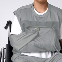 アームスリングと一体化したシャツ。片手の小さな動作で簡単に着脱ができ、面ファスナーで前腕の高さを調整できます。肘は患側のループを引っ張り中央のボタンに留めることで固定します。通気性と速乾性が高い素材なので一年を通して着られます。