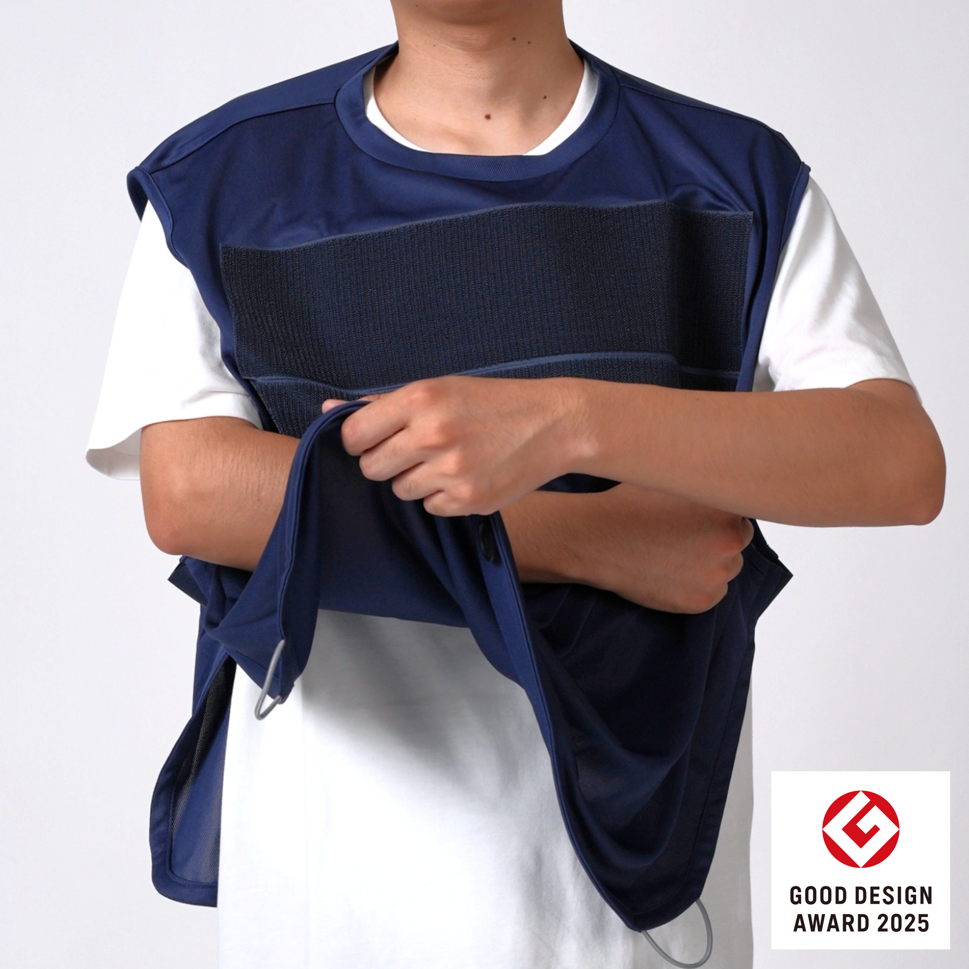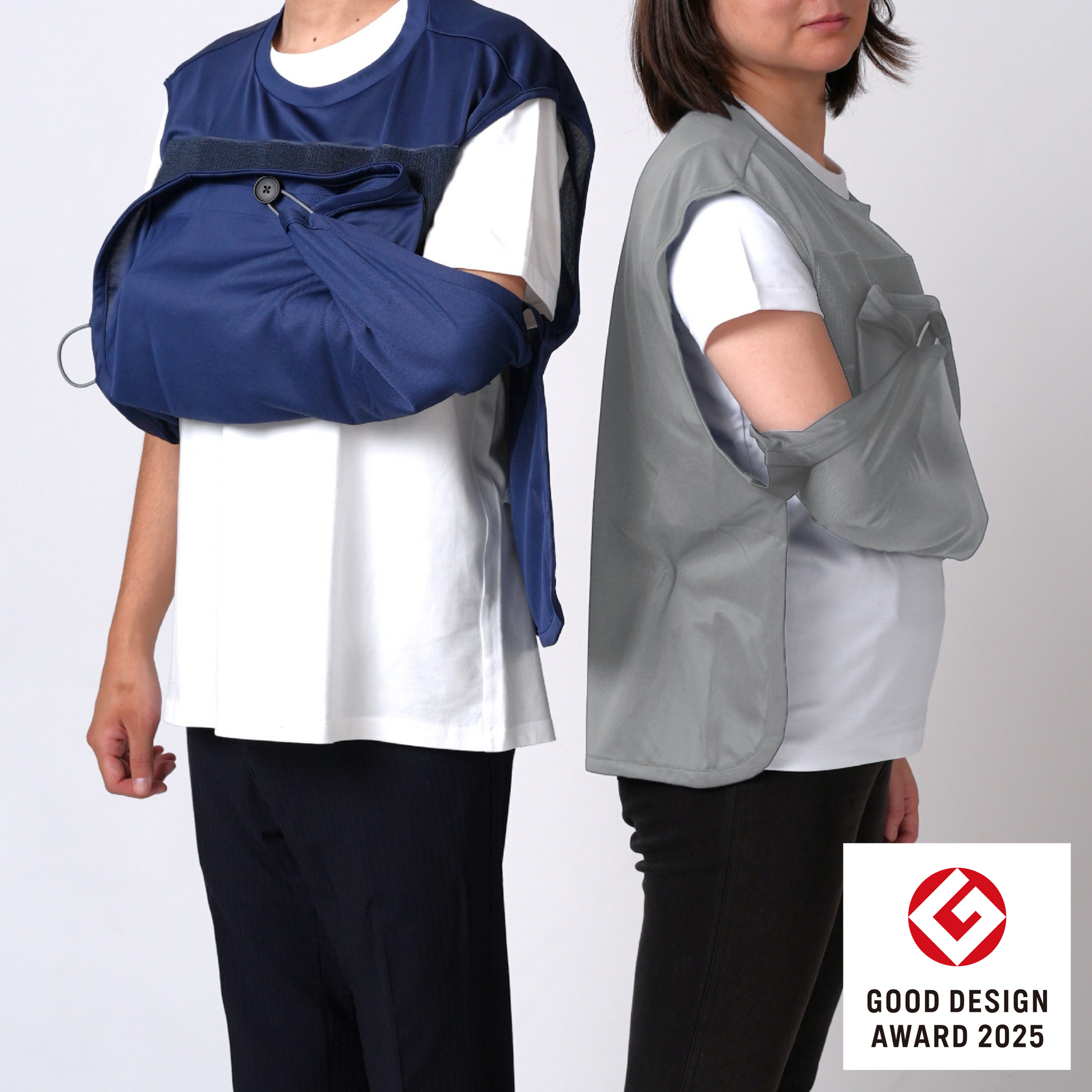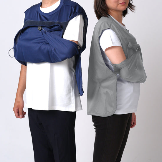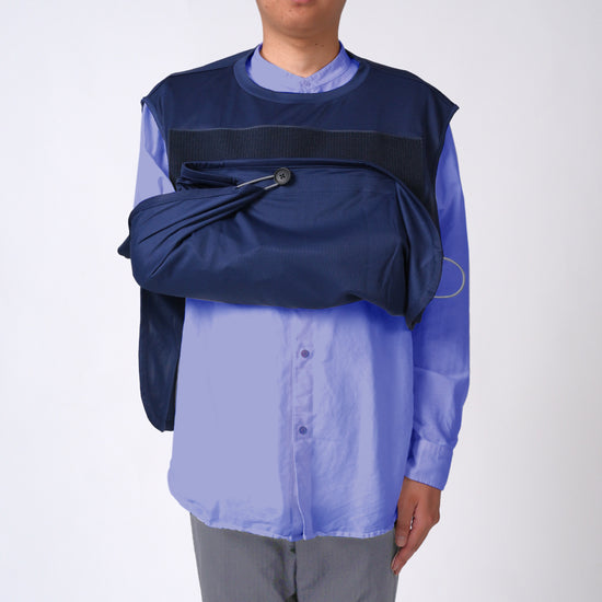 アームスリング(三角巾)と一体化した服。面ファスナーで形成される外袋に腕をゆだね、病院や施設、ご自宅内外で安心して生活を送れます。補助具をポジティブな日常着として装うことでリハビリを前向きな気持ちで取り組めます。片手で簡単に着脱、腕の保持/非保持の切り替え可能。通気性が良いので季節を問わず着られ上からも服を羽織れます。