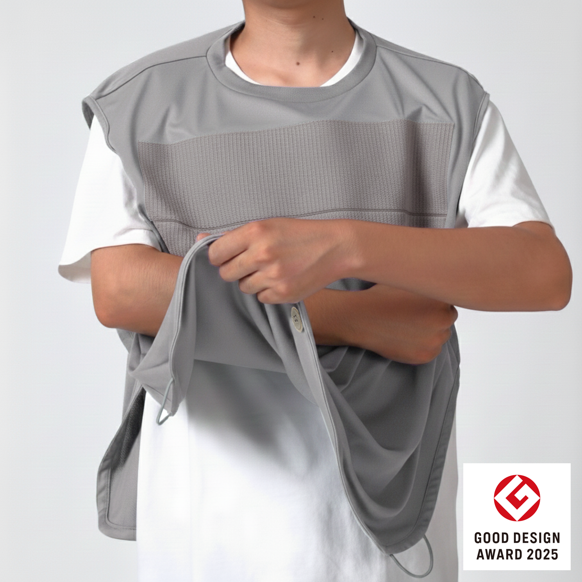 上肢の可動に制限を伴う方に向けた「歩行」と「外出」を自立支援する衣服です。また、車椅子を利用している場合の手の挟み込みや車輪への巻き込みを防ぎ、介助者がいる場合は「移乗」も支援します。サイズは男女兼用フリーサイズです。