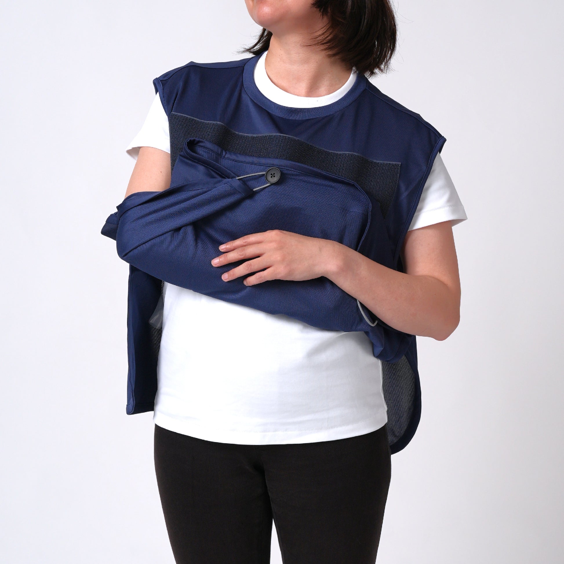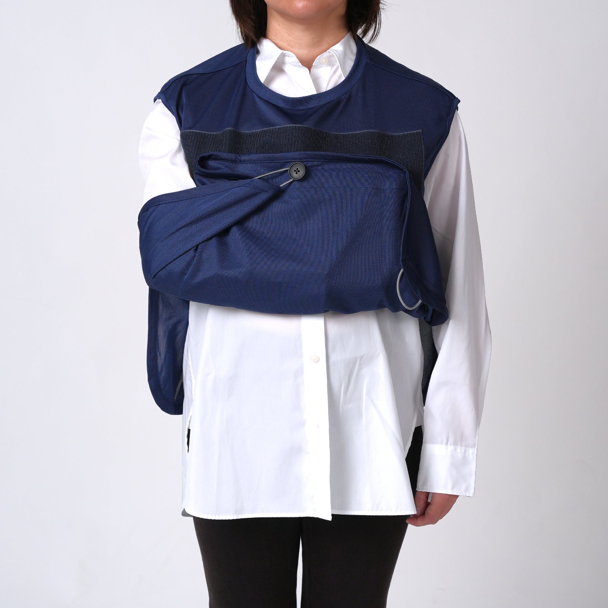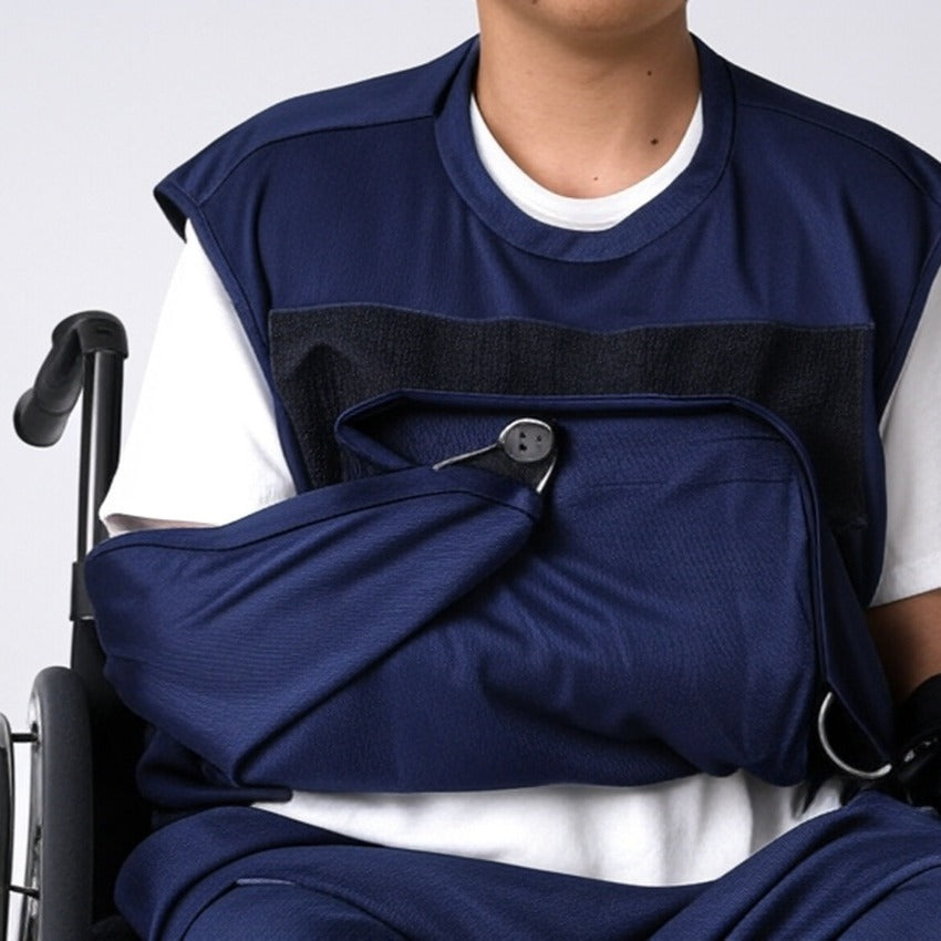 アームスリング(三角巾)と一体化した服。面ファスナーで形成される外袋に腕をゆだね、病院や施設、ご自宅内外で安心して生活を送れます。補助具をポジティブな日常着として装うことでリハビリを前向きな気持ちで取り組めます。片手で簡単に着脱、腕の保持/非保持の切り替え可能。通気性が良いので季節を問わず着られ上からも服を羽織れます。