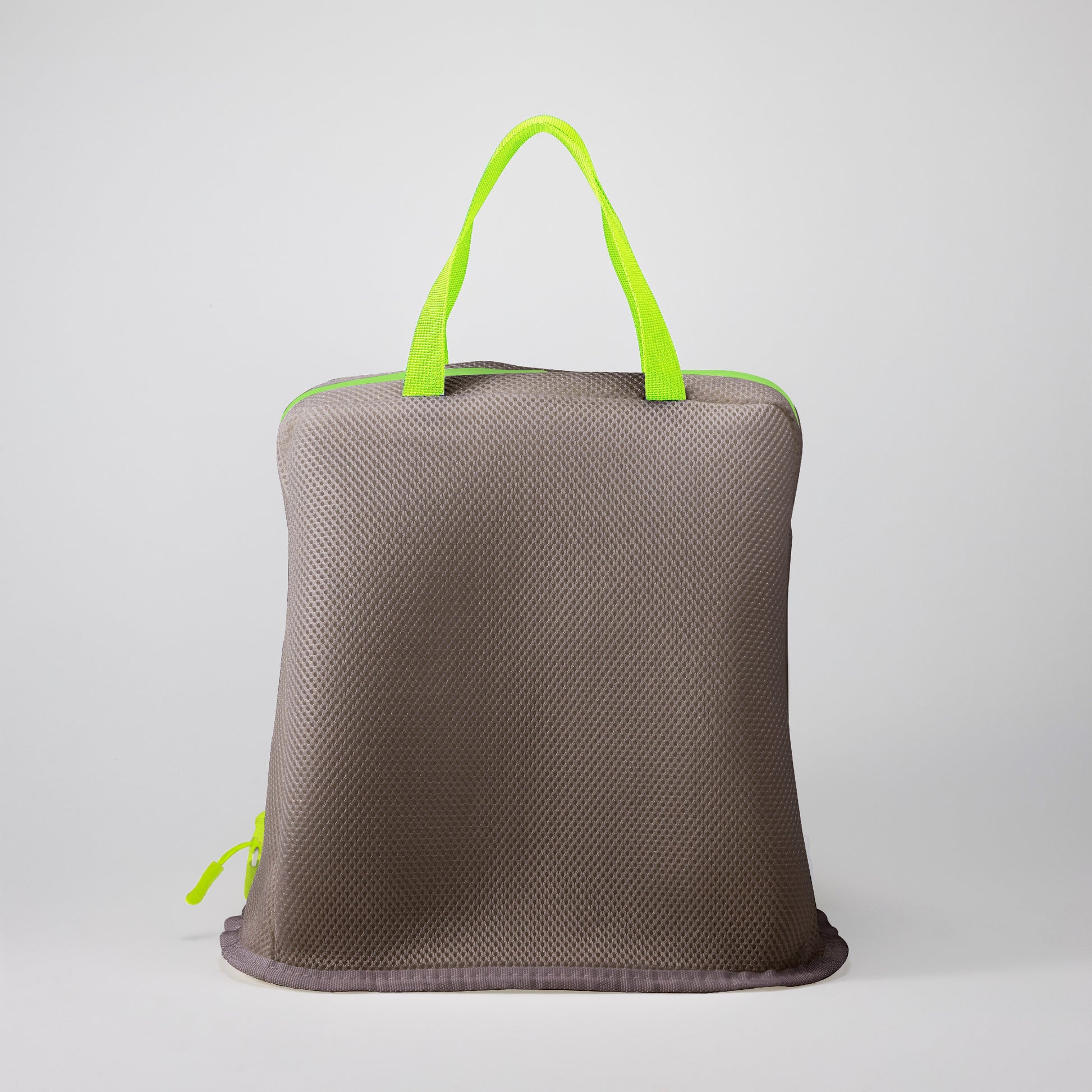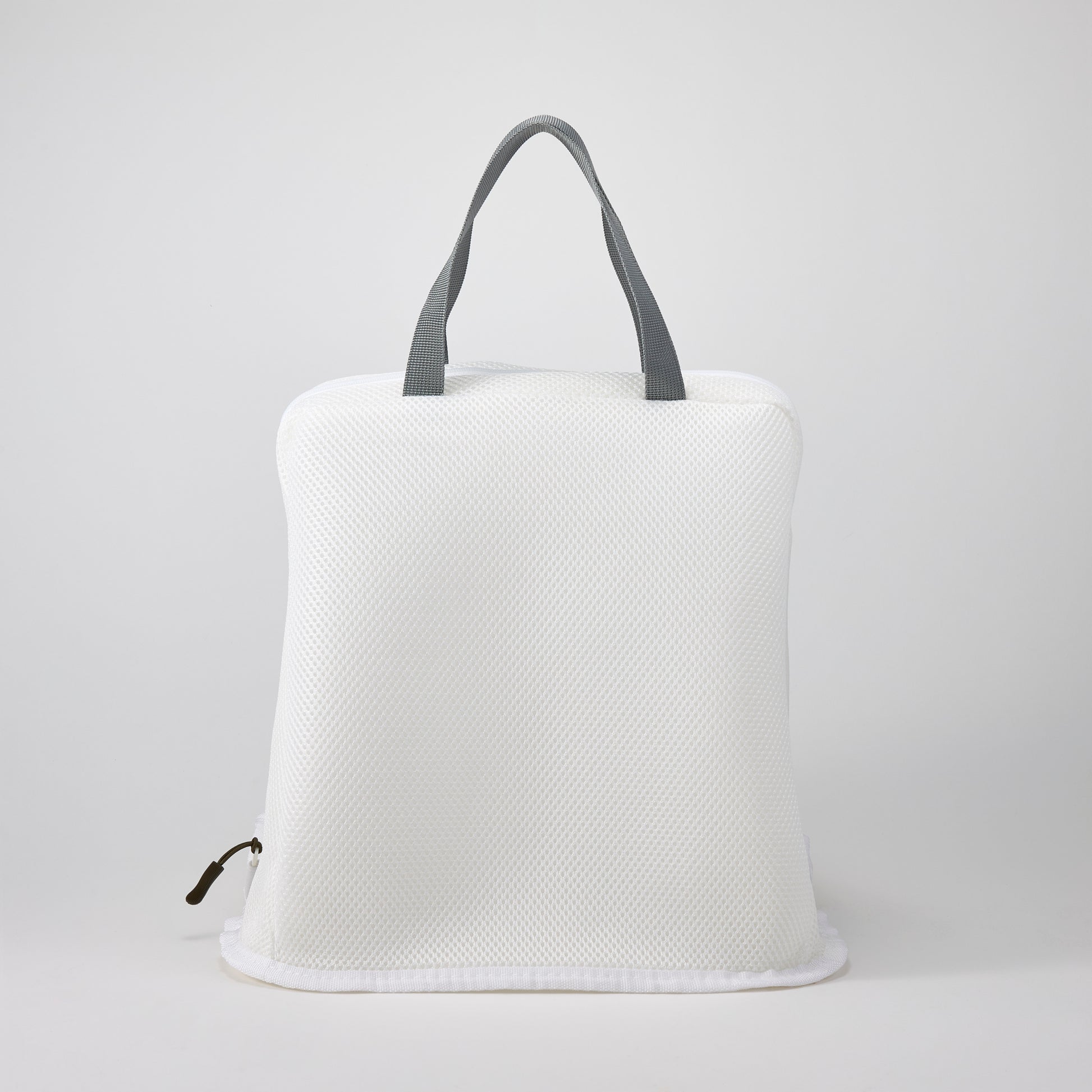 洗濯用ネットと脱衣かごが一体化したバッグ型の洗濯支援ツールです。脳卒中による片麻痺、リウマチ、肩の傷病等で、指・手・肩関節の可動に制限がある方々が、脱衣かごへ服を入れる、洗濯用ネットへ服を移す、ネットを洗濯機に入れる、洗濯後に服を取り出す、干し場まで運ぶといった洗濯に伴う一連の作業を一つのバッグで円滑に実現することができます。バッグの丸みに沿うつまみやすいファスナーは無理なく開閉が可能です。痛く、疲れる洗濯を前向きな営みに変えます。